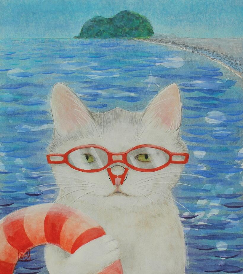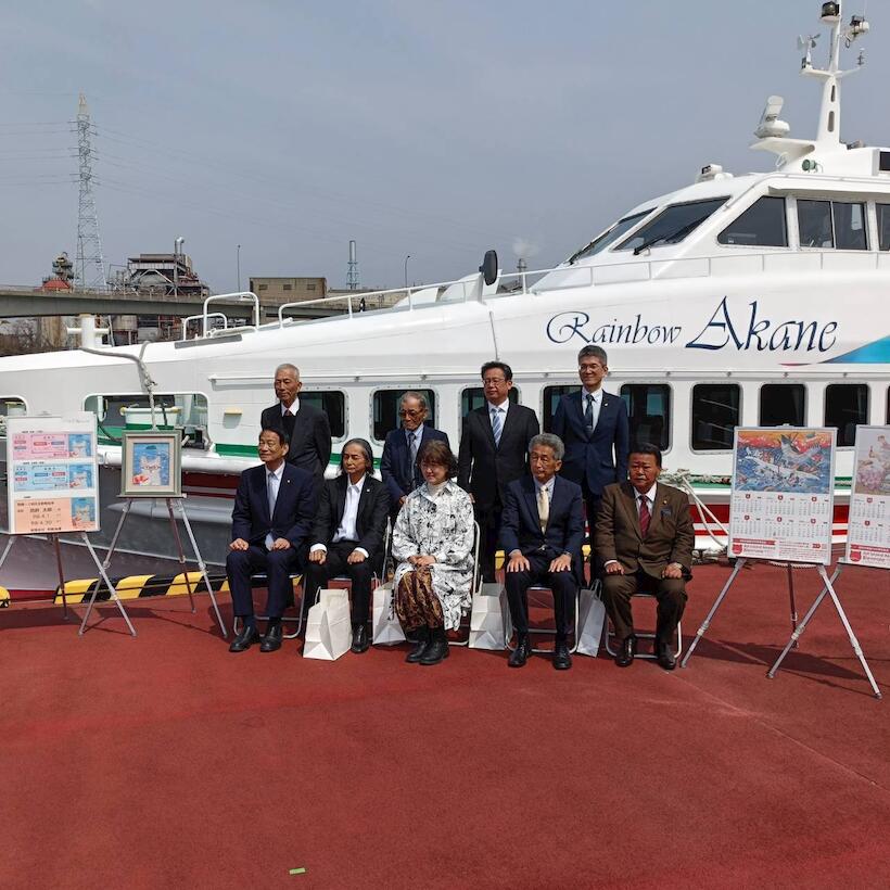 絵の猫は、野島小中学校生徒さんから「つぐみぃー」の名前をもらいました。生徒の皆さんがカヤックに乗る海水浴場の津久美浜からヒントを得たものです。この絵は船内に設置され、野島~三田尻間を往復しています。