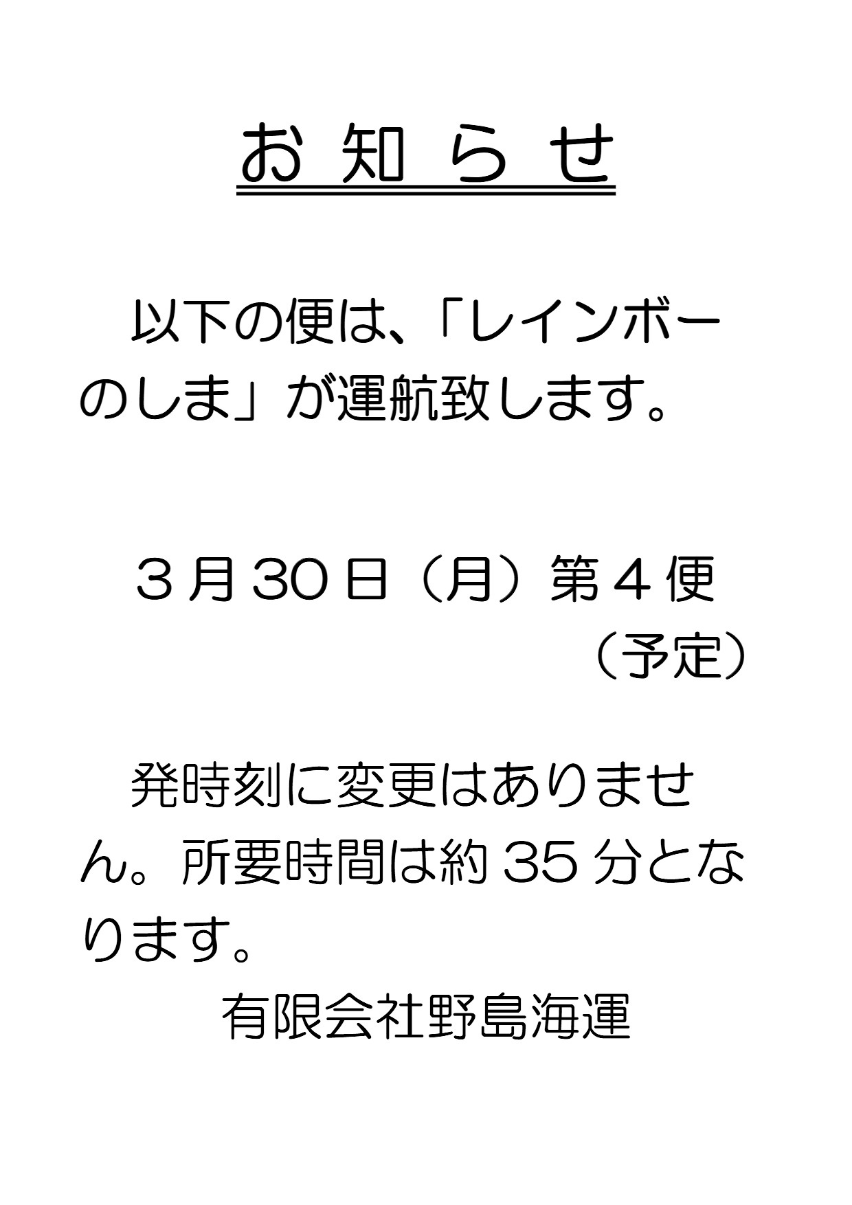 2026年03月24日(火) お知らせ NEW 【重要】「レインボーのしま」が運航致します 以下の期間は、「レインボーのしま」が運航致します。 3月30日(月)第4便 野島発16:30 三田尻発17:45 (予定) 所要時間が、約35分となります。